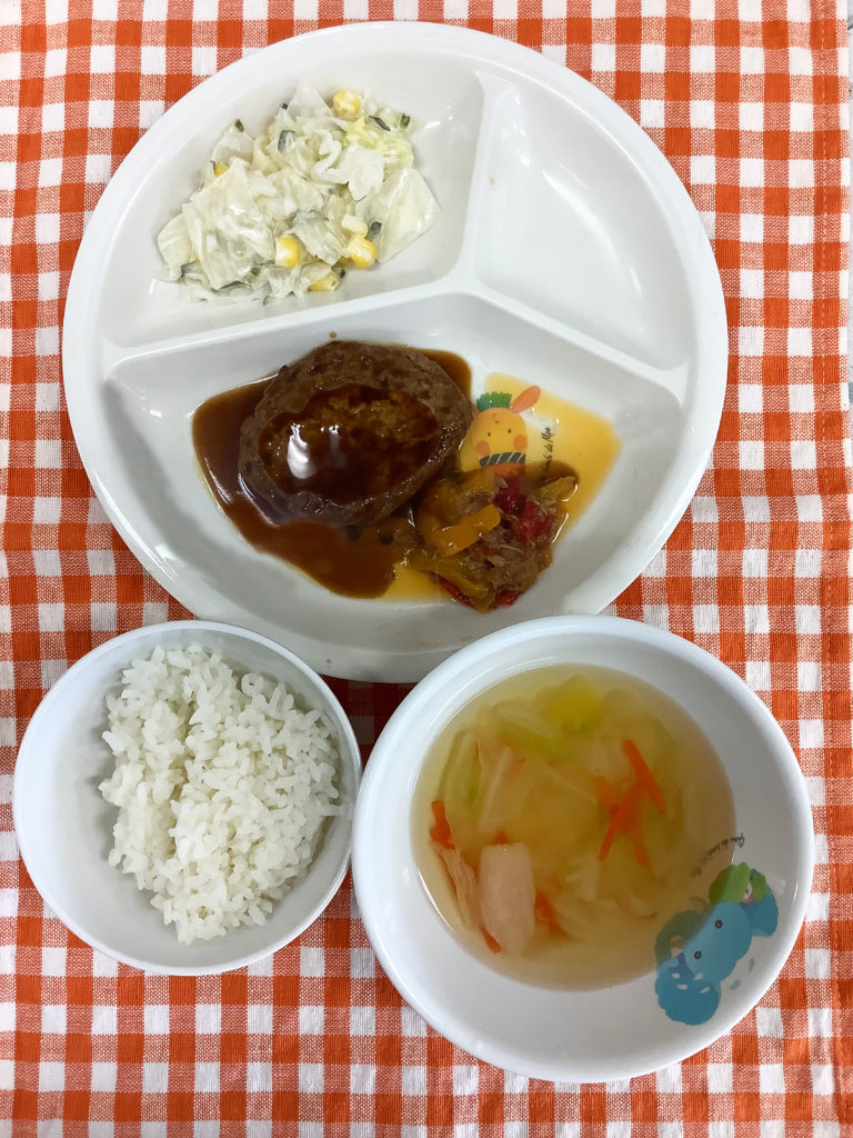 ・煮込みハンバーグと付け合わせ(ピーマン・キャベツ)