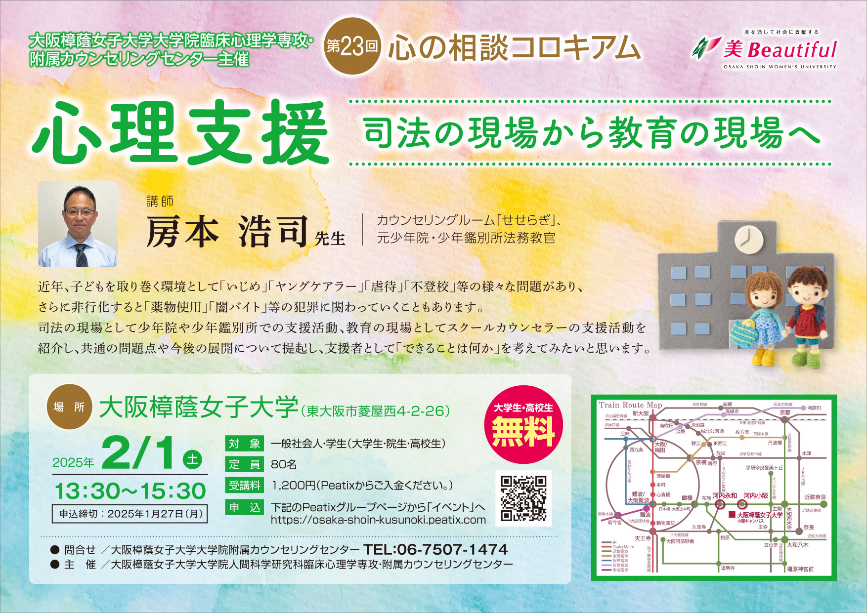 【2024年度秋期公開講座】「第23回心の相談コロキアム: 心理支援 司法の現場から教育の現場へ」【Peatix】