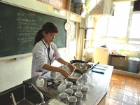 まずは、学生がお手本でプリンを作りながら説明をした後、次は子どもたちもプリン作りに挑戦しました。最初は慣れない手つきでしたが、友だちと協力しながら積極的にプリンを作りました。 子どもたちはカップに自分の名前を書き、1人1つずつマイプリンを作り、出来上がりが待ち遠しそうでした。